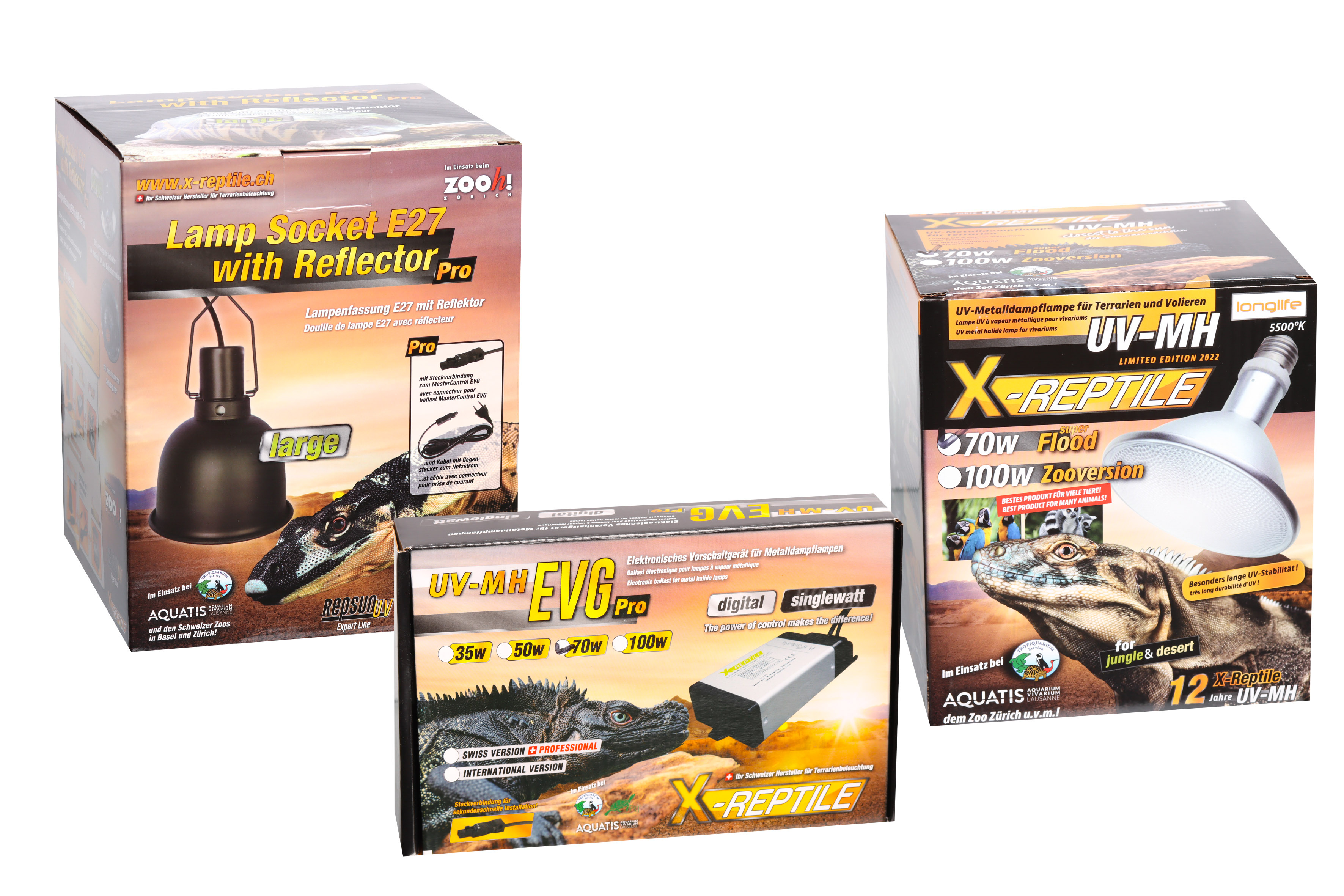 Die X-Reptile UV-MH (HID-Strahler) sind die zur Zeit modernsten und effizientesten Lampen für Terrarien. Sie erzeugen gleichzeitig naturnahe UV-Abstrahlung, konzentrierte Wärme und ein sehr helles Grundlicht (z.B. 70'000-100'000 Lux bei 30cm). Es handelt sich also nicht mehr nur um "UV-Strahler" im klassischen Sinne (wie bei den Mischlichtstrahler), sondern um Lampen, die wie keine andere Beleuchtungstechnik das natürliche Licht der Sonne in seiner Gesamtheit imitieren. Die Lampen wurden bei bekannten Schweizer Zoos und bei Tierärzten getestet und haben sich bei sonnenliebenden Reptilien (z.B. Bartagamen, Leguane, Warane, Schildkröten), exotischen Vögeln und Krallenäffchen hervorragend bewährt.