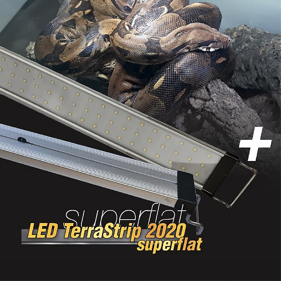 Für die neuen LED TerraStrips haben wir 2025 lange getestet und die besten Eigenschaften der bisherigen LED's mit wichtigen Verbesserungen gegenüber anderen LED's vereint! Nicht nur beeindruckend hell, sondern auch mit neuem Spektrum, superflach und vor allem auch sanft in der Lichtverteilung! Zur Grundbeleuchtung bei Pflanzen und Tieren mit verschiedenen Installationsmethoden. Kann mit den mitgelieferten Halter einfach auf den Rand eines Terrariums gestellt werden oder durch Entfernen der Halter auch flach auf das Terrarium gelegt werden.